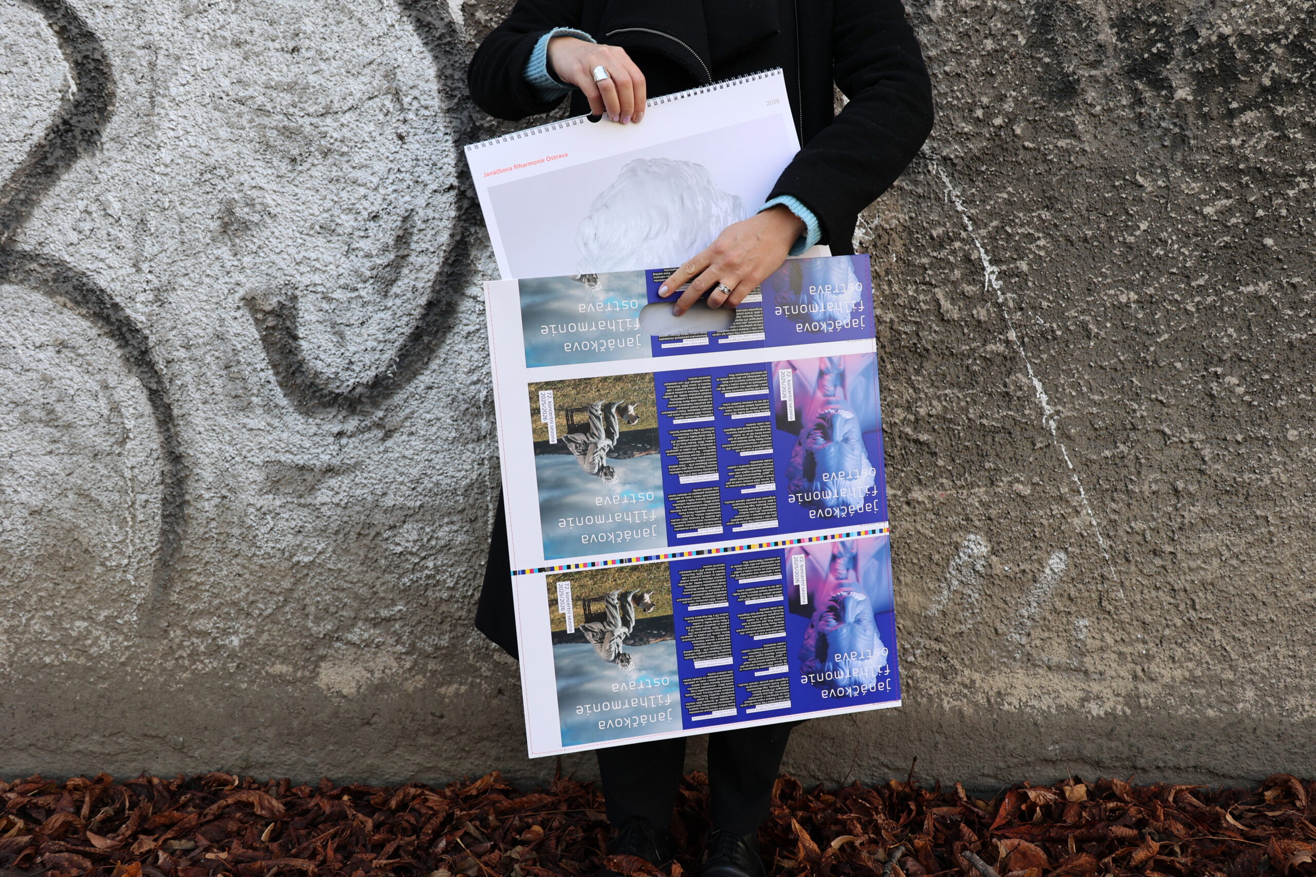 Stejně jako naše programové katalogy vznikl i kalendář v Tiskárně Helbich a graficky jej navrhl Štěpán Malovec. Každý kus je navíc doplněn o ručně vyrobený obal z upcyklovaných materiálů, který pro nás s láskou vytvořila Gabriela Pilařová z ostravského upcyklačního studia Papidu.