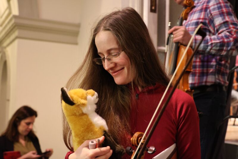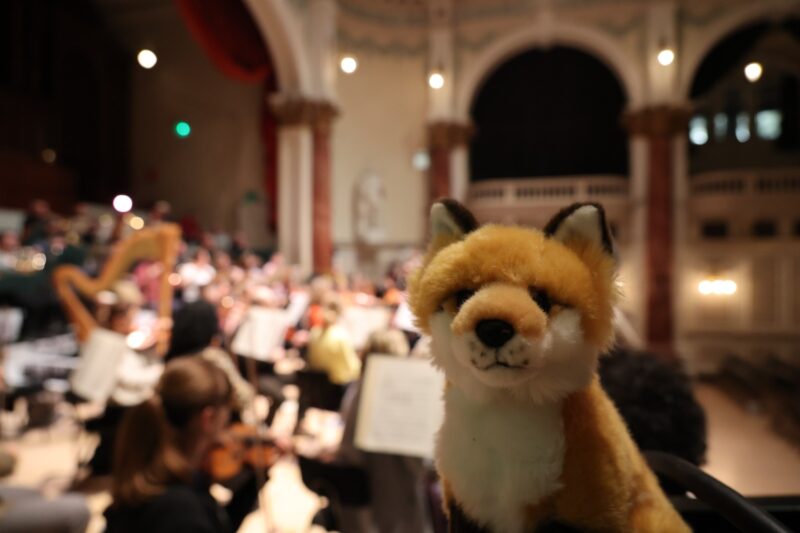 Ta naše plyšová si během turné získala srdce publika i samotných hráčů. A jak se ukázalo, v místním muzeu naši členové orchestru objevili i její vzdálenou příbuznou. Živá liška Bystrouška pak přišla pozdravit našeho violoncellistu Lukáše Novotného a podařilo se mu ji dokonce zachytit na fotografii.